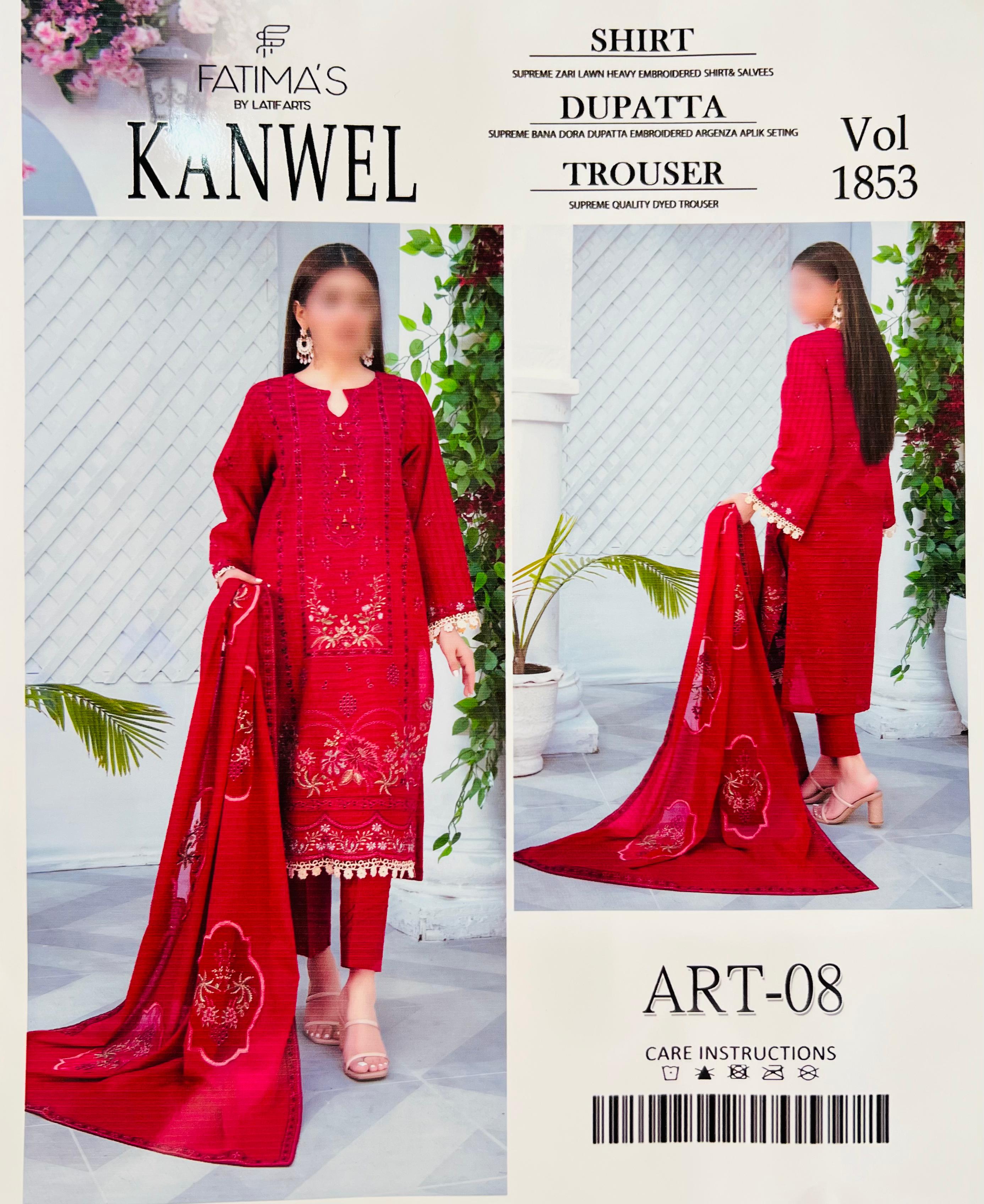 Kanwal  by Fatima BrandShirt Supreme Zari Lawn Heavy Embroided Short & SaleevesDupatta Supreme Bana Dora Dupatta Embroided Argenza Aplik Setting Trouser Dyed Plain Trouser