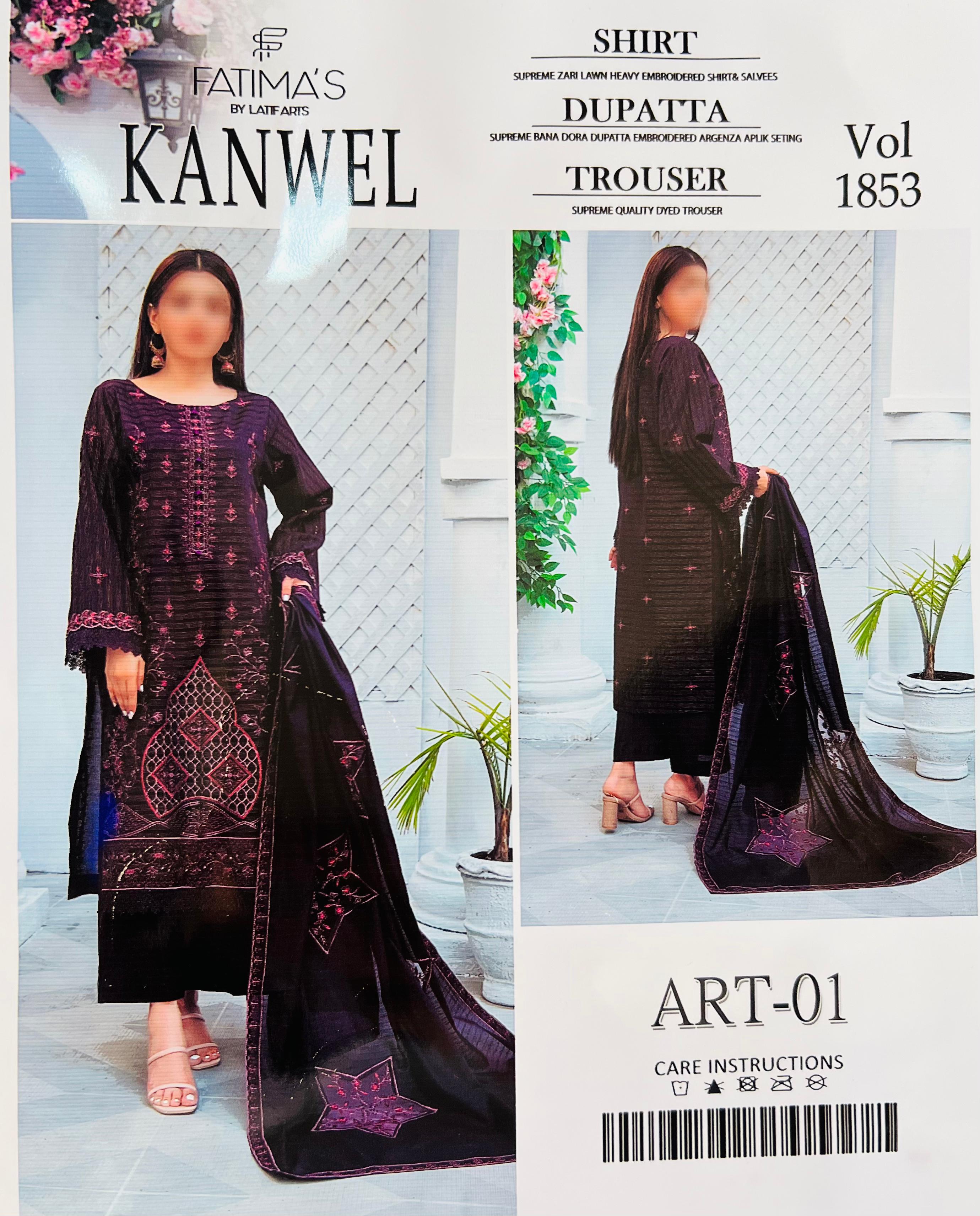 Kanwal by Fatima BrandShirt Supreme Zari Lawn Heavy Embroided Short & SaleevesDupatta Supreme Bana Dora Dupatta Embroided Argenza Aplik Setting Trouser Dyed Plain Trouser
