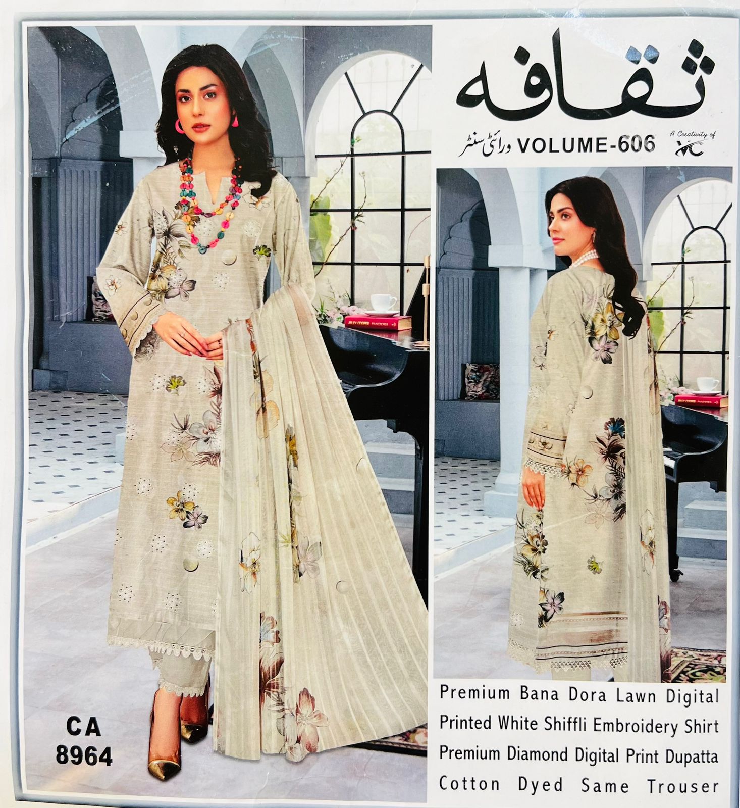 Saqafah BrandPremium Bana Dora Lawn Digital Printed White Shiffli Embroidery ShirtPremium Diamond Digital Print DupattaCotton Dyed Same Trouser