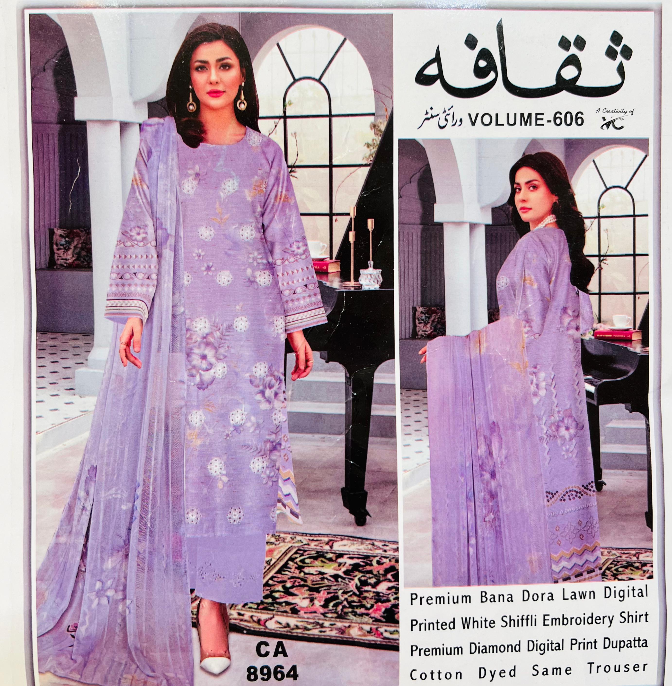 Saqafah BrandPremium Bana Dora Lawn Digital Printed White Shiffli Embroidery ShirtPremium Diamond Digital Print DupattaCotton Dyed Same Trouser