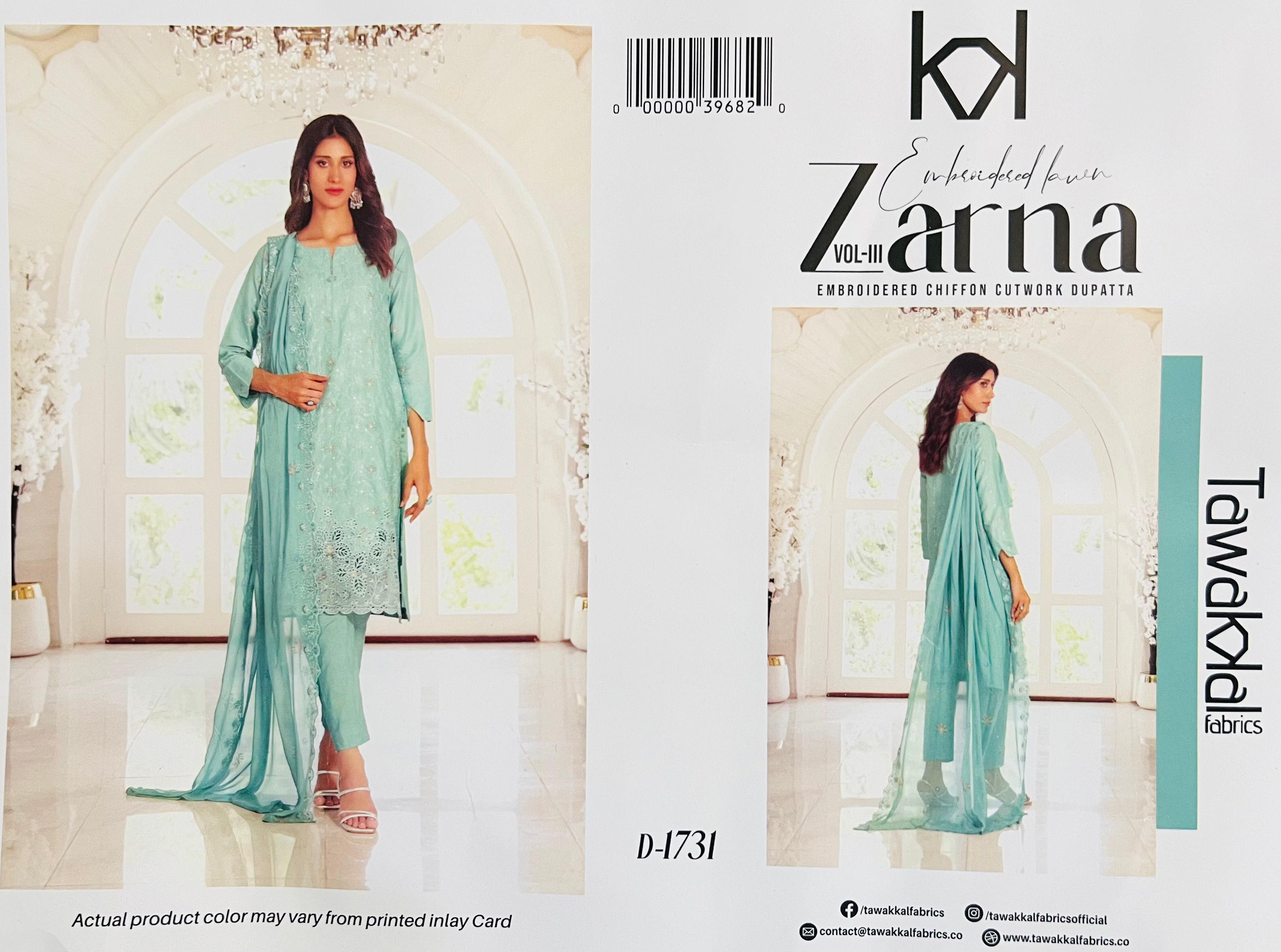 Zarna by Tawakkal BrandLuxury 3 piece Embroided VolumeFull Embroided shirt with patch workLight embroided Back Shifoon cut work DupattaPlain Trouser