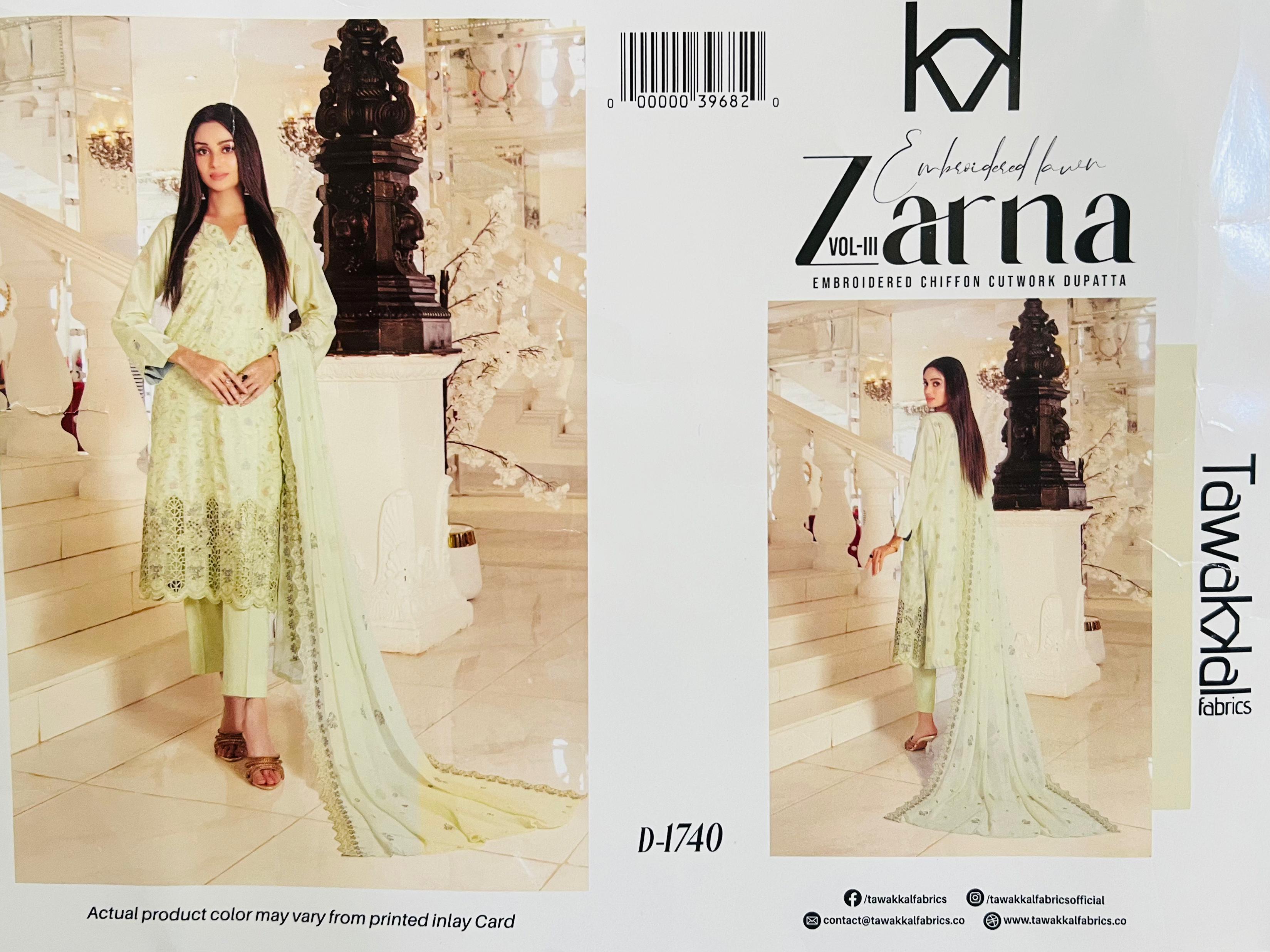 Zarna by Tawakkal BrandLuxury 3 piece Embroided VolumeFull Embroided shirt with patch workLight embroided Back Shifoon cut work DupattaPlain Trouser