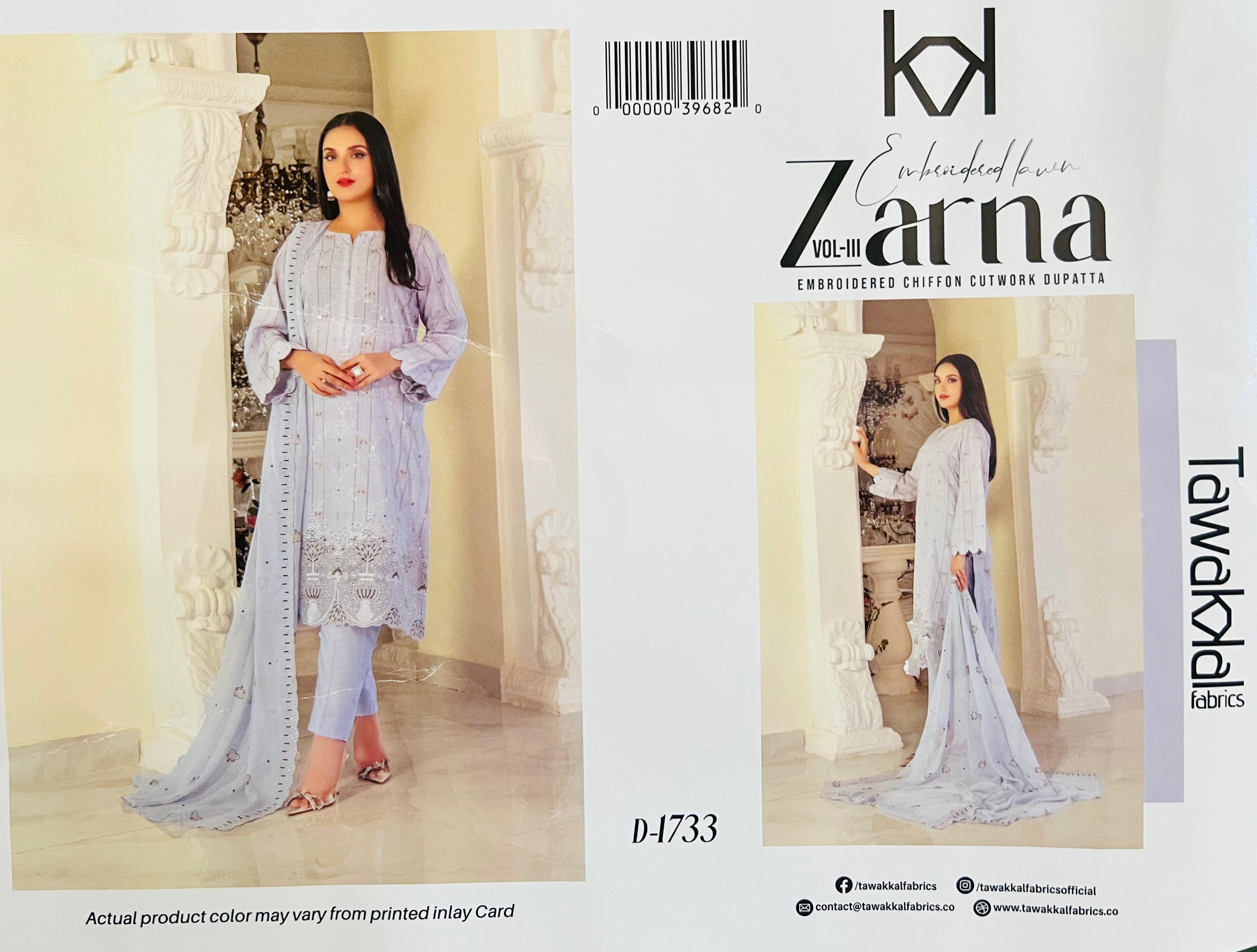 Zarna by Tawakkal BrandLuxury 3 piece Embroided VolumeFull Embroided shirt with patch workLight embroided Back Shifoon cut work DupattaPlain Trouser