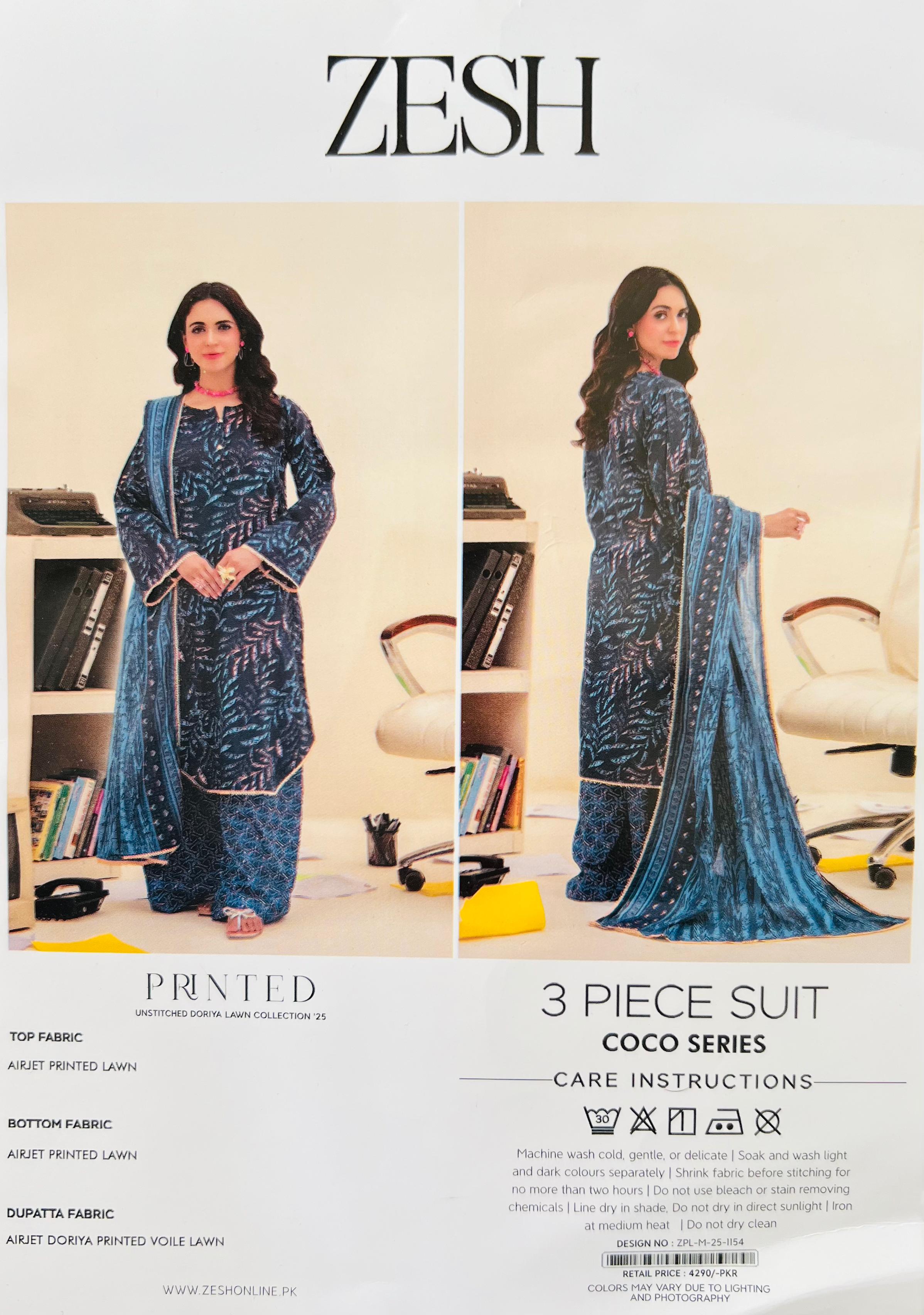 Zesh Brand 3 Piece Coco Series – Airjet Printed Lawn Discover elegance and comfort with the Zesh Brand Coco Series, crafted from premium Airjet Printed Lawn paired with a plain dyed...
